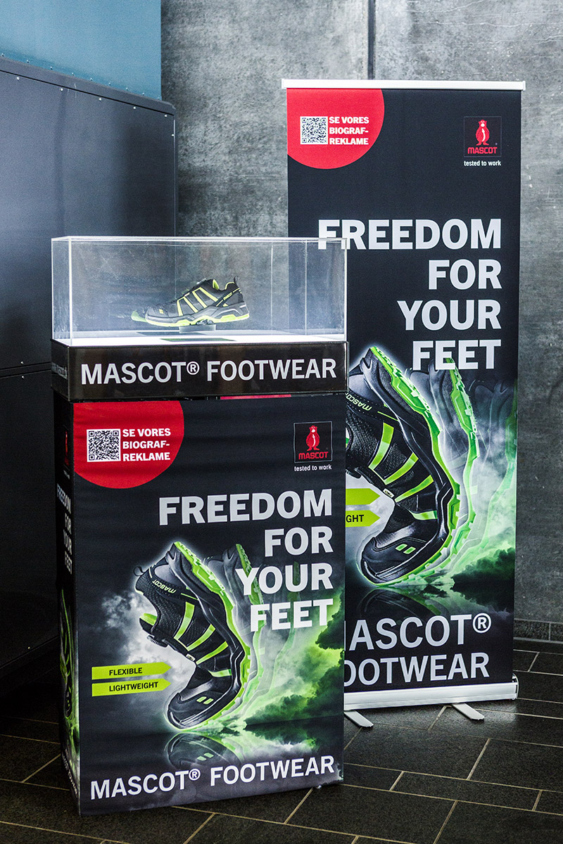 Med denne biografkampagne øger Mascot kendskabsgraden til deres brand via fuld opmærksomhed fra et købestærkt og kvalitetsbevidst publikum. Mascot udnytter hele biografens univers ved samtidig at udstille displays med deres produkt i udvalgte biografers foyer. De opnår stor synergieffekt og via flere kontaktpunkter skaber de interesse og opmærksomhed omkring enkelte produkter, som her deres arbejdssko.